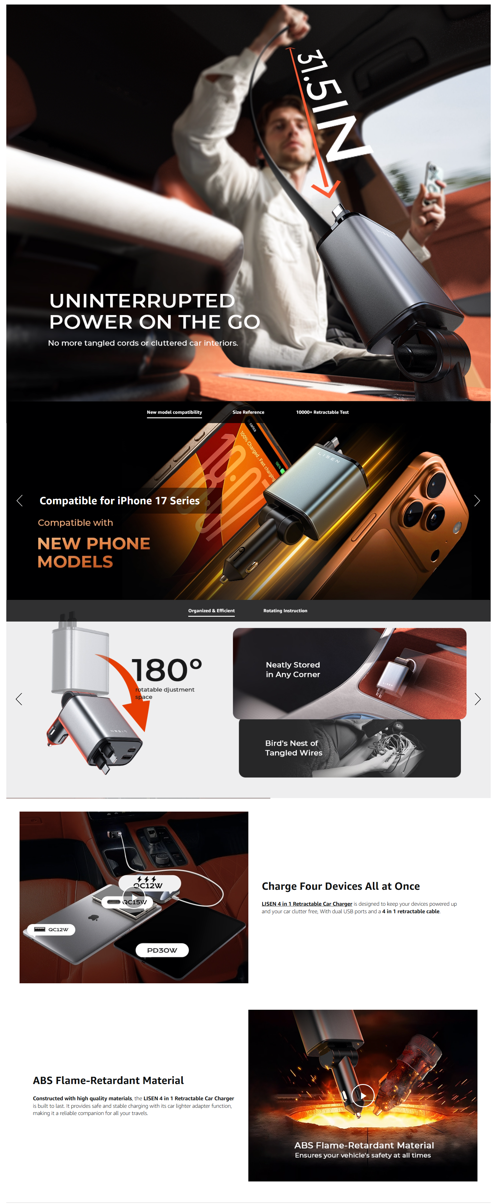 LISEN Retractable Car Charger, for Christmas Day Gifts for Men Women, 69W Cars Adapter USB C Fast Charger for iPhone 17